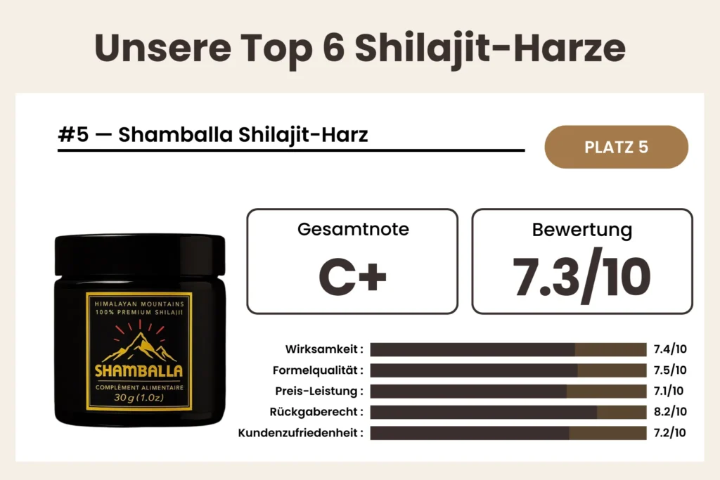 Shamballa bietet Shilajit-Harz zu zugänglichen Preisen mit grundlegenden Qualitätsstandards. Obwohl das Produkt echtes Himalaya-Harz zu sein scheint, ordnen es die fehlende umfassende Testdokumentation und unterschiedliche Kundenerfahrungen in die untere Qualitätsstufe ein.