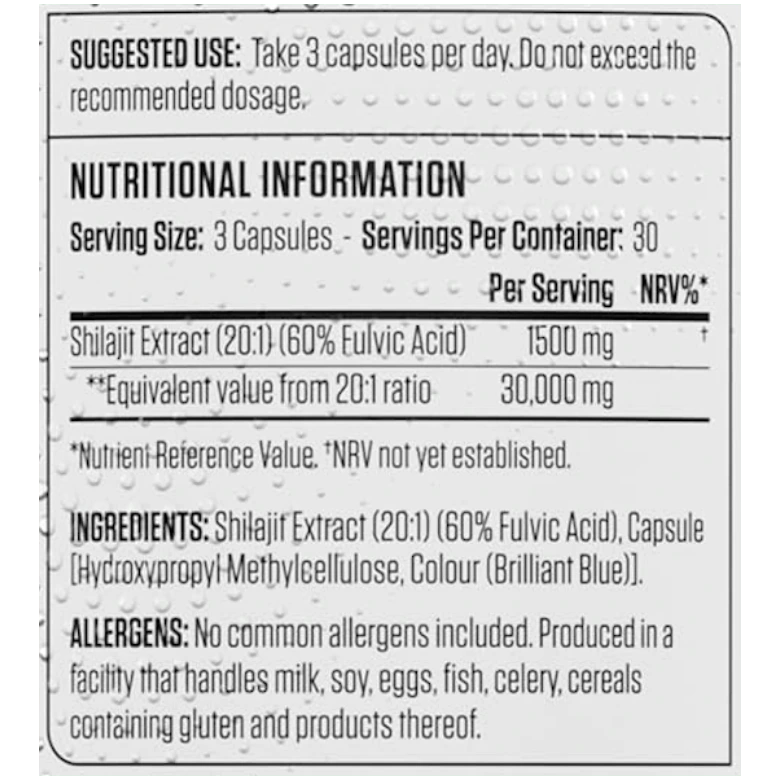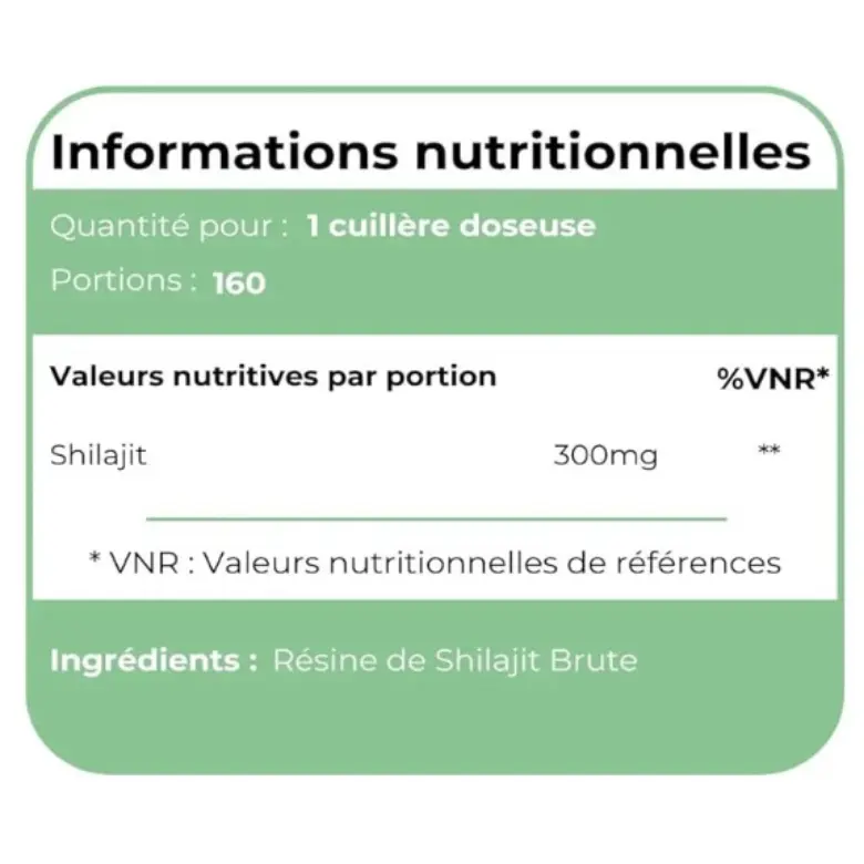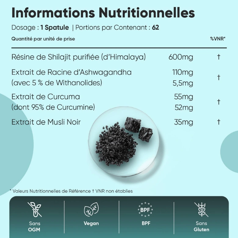 - Par portion : 500 mg de résine de Shilajit himalayen (Gilgit-Baltistan, altitude 16,000–18,000 ft)